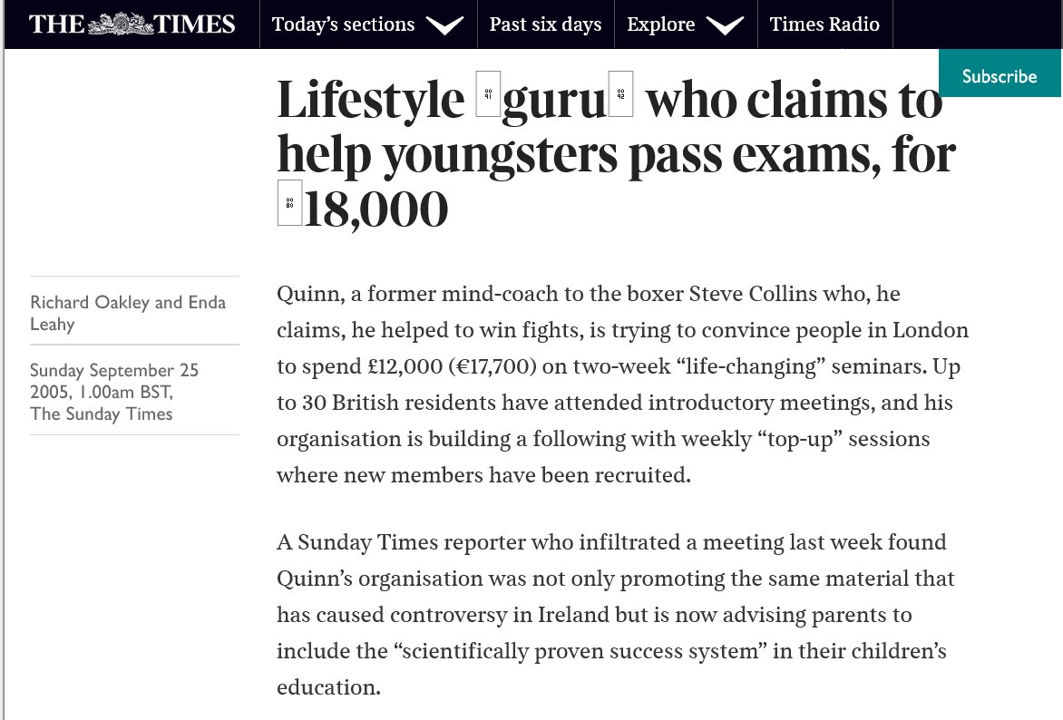 In 2005 The Sunday Times sent in an undercover-journalist who reported on the EDUCO Cult's recruitment events in London, and exposed how the Cult had plans to expand in the UK and to target Children with EDUCO's discredited form of "Hypnotherapy" or "Mindfulness Training".