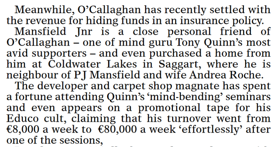 O'Callaghan featured in EDUCO Cult promotional videos where he boasted of his business growth having attended an EDUCO Seminar held by Cult-leader "Dr" Tony Quinn.