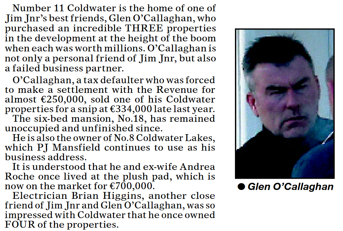 O'Callaghan was sued by Allied Irish Banks in 2010, along with Jim Mansfield Jr (the original owner of 10 Coldwater Lakes) for €6.3 million.