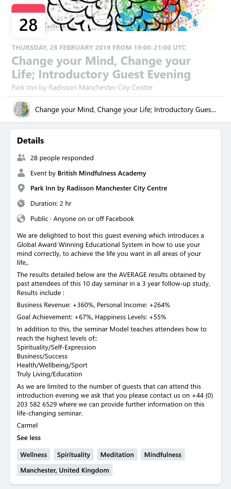 Margaret is even a team-member of an EDUCO Cult front-group The British Mindfulness Academy that has recruited in Manchester as recently as 2019, defrauding vulnerable UK women with the promise of Enlightenment from "Dr" Tony Quinn.