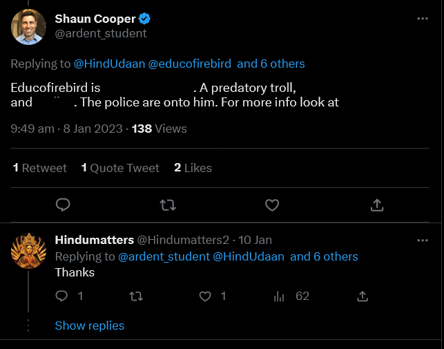 EDIT (17 February 2023): Shaun Cooper has additionally interacted with a Twitter account that is currently under investigation by the UK Parliament's House of Lords for the harassment of a journalist who exposed how cult-leader Nithyananda's representative was courted by the Hindu Forum of Britain in the Houses of Parliament in 2022: