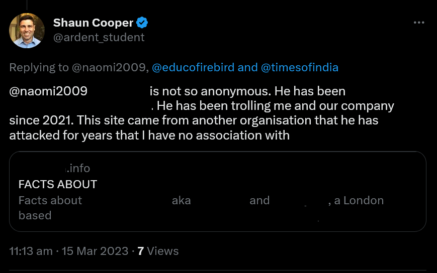 EDIT (15 March 2023): Shaun Cooper repeated this assertion that he has been in contact with EDUCO and was provided with my name and the address of an "Attack Website":