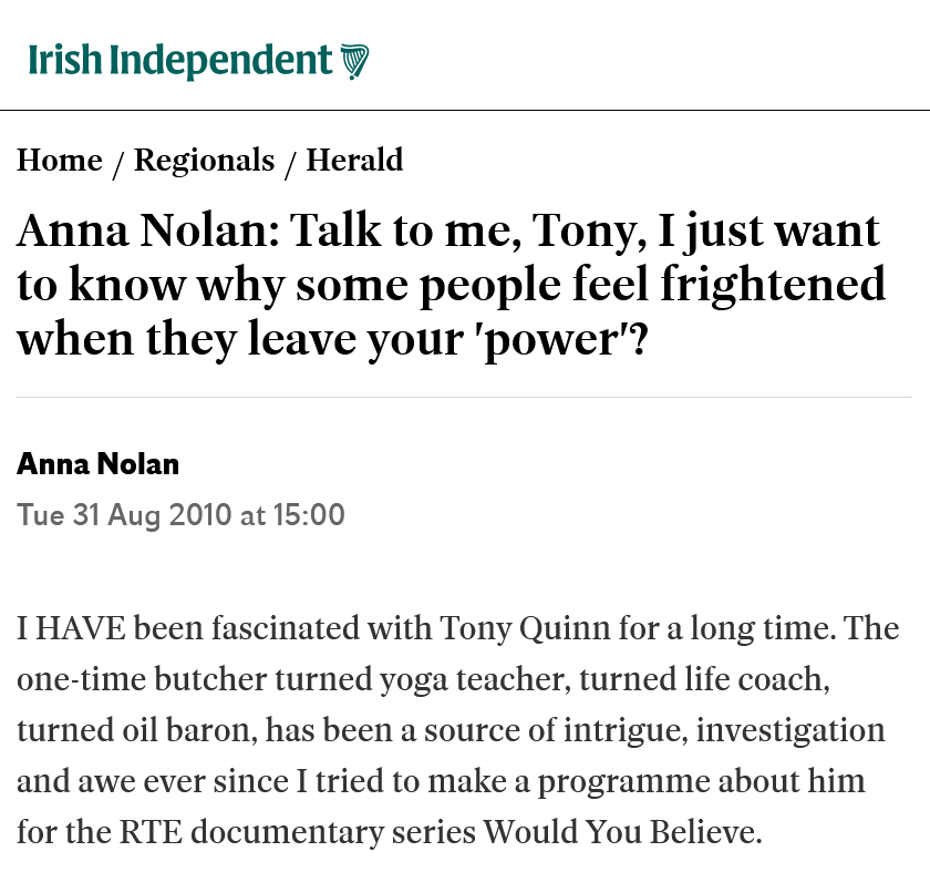 In 2010, RTÉ journalist Anna Nolan wrote for The Herald of the fear felt by those who leave Quinn's group.