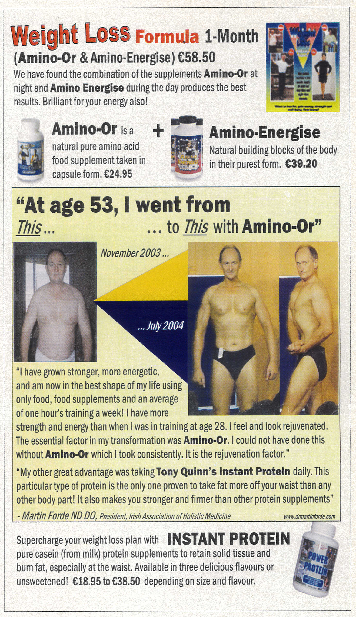 On one of the more recent brochures displayed prominently outside the Tony Quinn outlet in the Stephens Green Centre, we are introduced to Martin who, through the use of Tony Quinn products and supplements, went from flabby and out of shape to tanned and muscular. What we are not told is that Martin is actually Martin Forde, longtime senior associate of Tony Quinn. As one former follower of Quinn remarked, “It would be like the senior stylist at Peter Mark saying, ‘I only ever get my hair done at Peter Mark’”