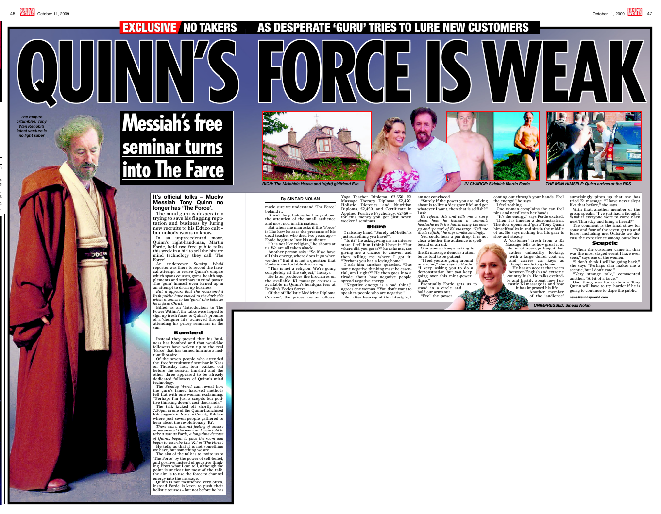 Instead they proved that his business has bombed and that would-be followers have woken up to the real ‘Farce’ that has turned him into a multi-millionaire. Of the seven people who attended the free ‘recruitment’ seminar in Naas on Thursday last, four walked out before the session finished and the other three appeared to be already dedicated followers of Quinn’s mind technology.