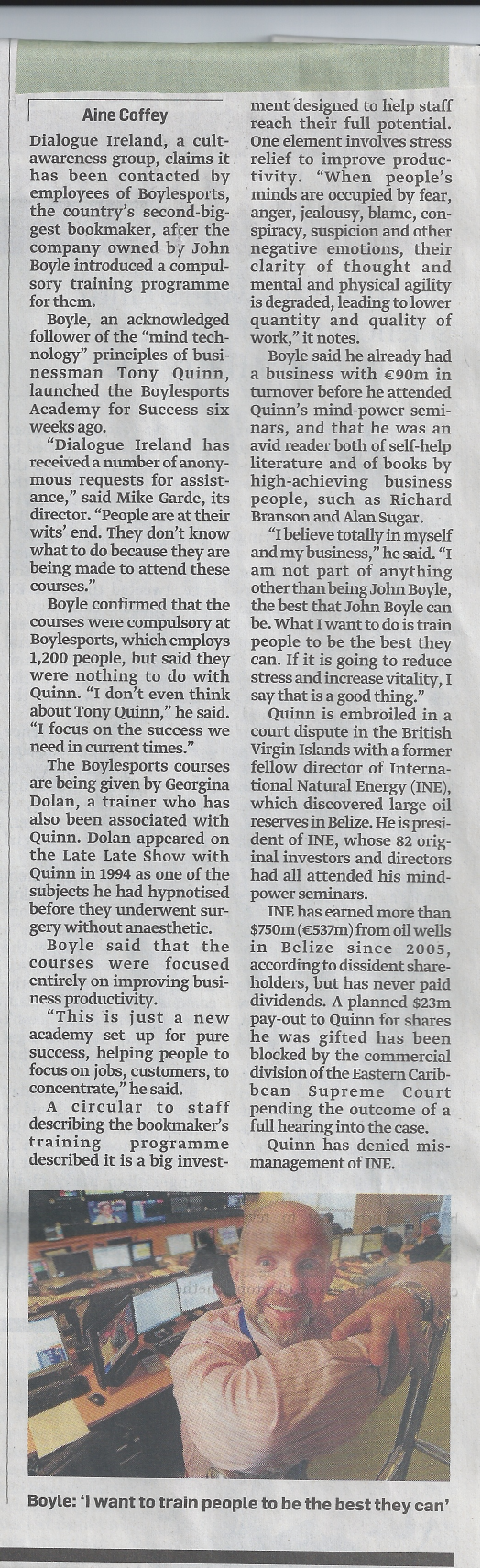 Dialogue Ireland, a cult-awareness group, claims it has been contacted by employees of Boylesports, the country’s second-biggest bookmaker, after the company owned by John Boyle introduced a compulsory training programme for them.