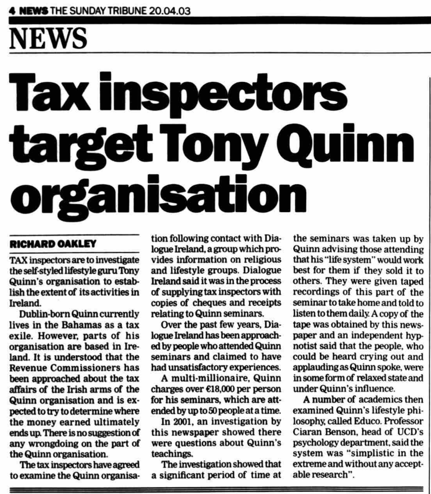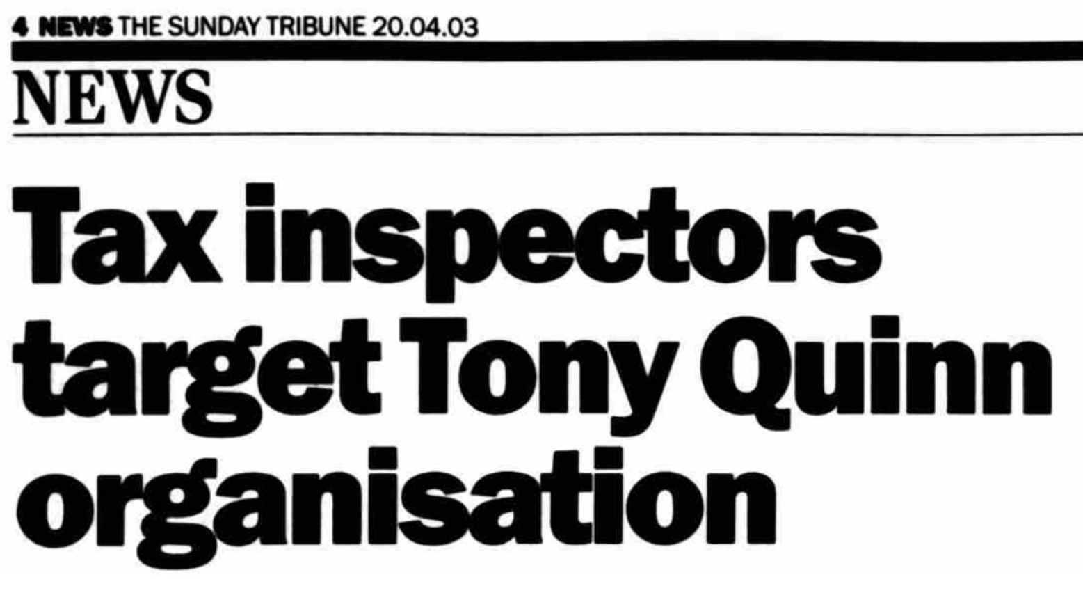 "Tax Inspectors Target Tony Quinn Organisation", Sunday Tribune, by Richard Oakley