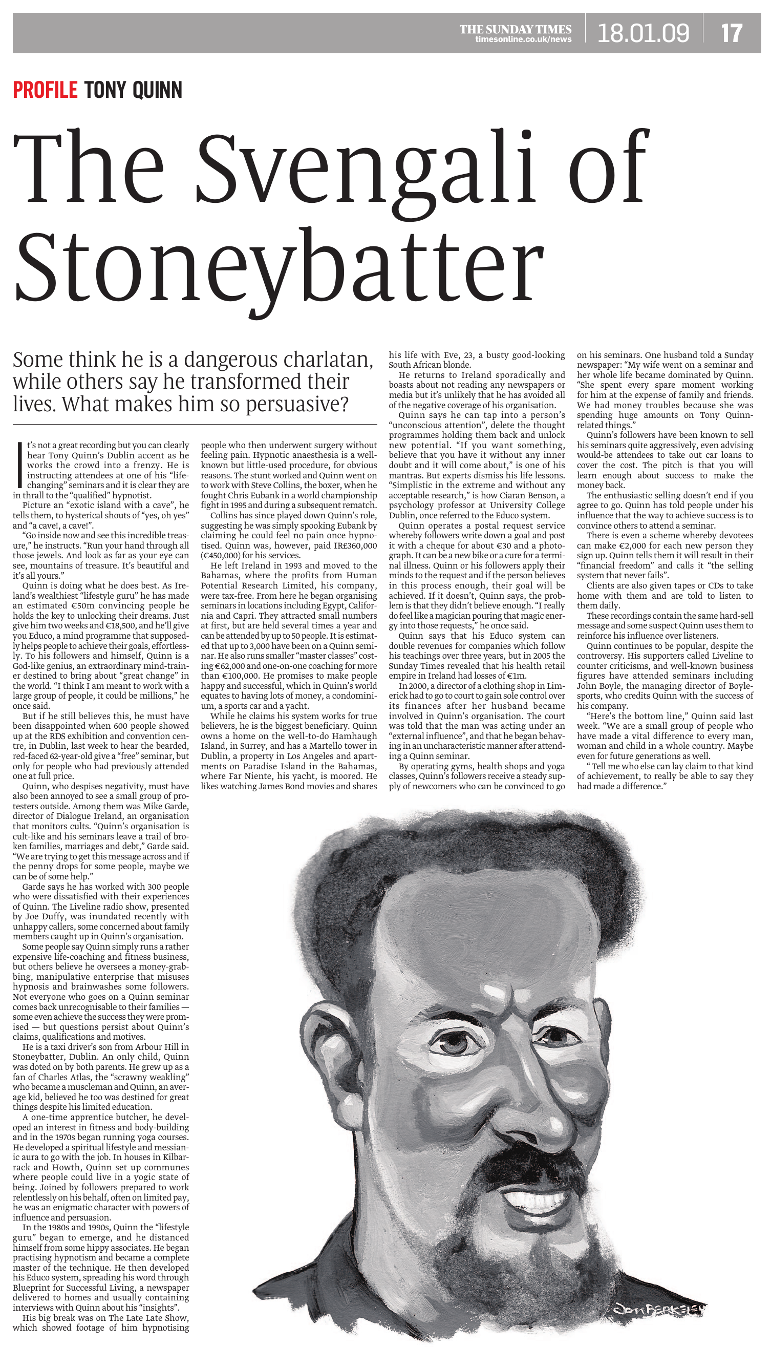 Garde says he has worked with 300 people who were dissatisfied with their experiences of Quinn. The Liveline radio show, presented by Joe Duffy, was inundated recently with unhappy callers, some concerned about family members caught up in Quinn’s organisation. Some people say Quinn simply runs a rather expensive life-coaching and fitness business, but others believe he oversees a money-grabbing, manipulative enterprise that misuses hypnosis and brainwashes some followers.