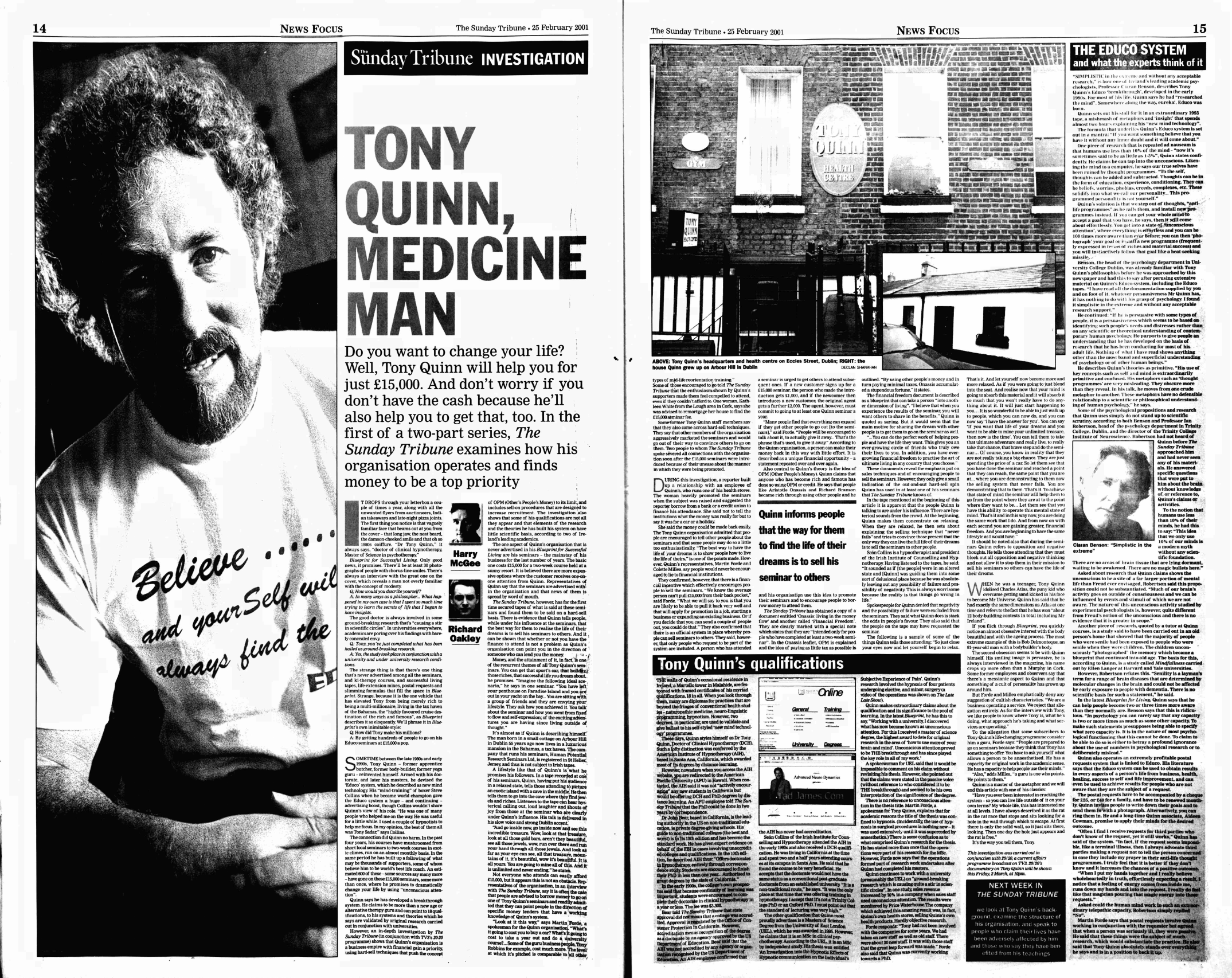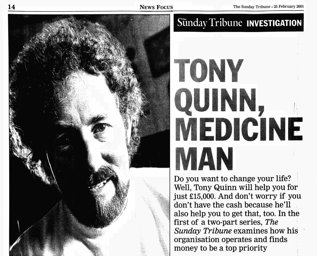 We look at Tony Quinn's background, examine the structure of his organisation, and speak to people who claim their lives have been adversely affected by him and those who say they have benefited from his teachings.